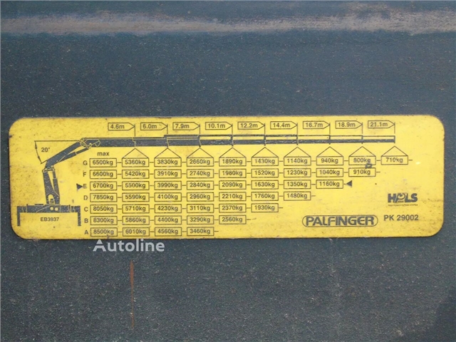 Informacje ogólne Kabina: dzienna Konfiguracja osi Oś przednia 1: Układ kierowniczy Oś przednia 2: Układ kierowniczy Oś tylna 1: Redukcja: redukcja piasty Oś tylna 2: Redukcja: redukcja piasty Funkcjonalność Żuraw: PALFINGER PK29002, rok produkcji 2004, z tyłu kabiny Stan Stan ogólny: bardzo dobrze Stan techniczny: bardzo dobrze Stan wizualny: bardzo dobrze Informacje dodatkowe Aby uzyskać więcej informacji, należy skontaktować się z Sales