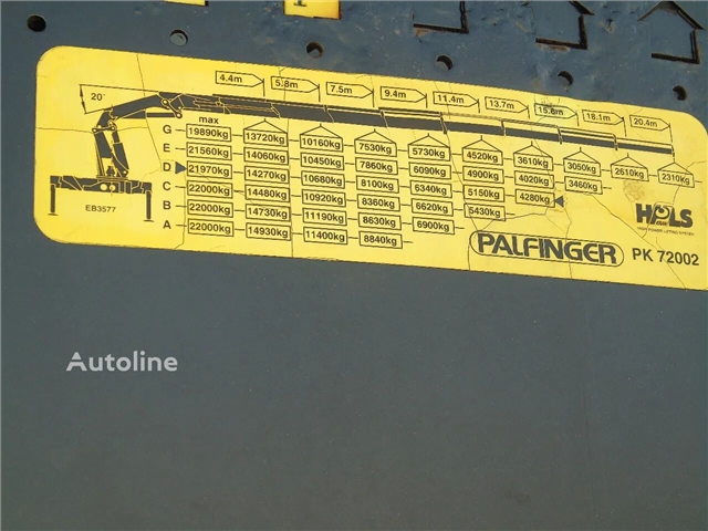 = Więcej opcji i akcesoriów = - Wał odbioru mocy = Więcej informacji = Funkcjonalność Maszt: teleskop (7 części) Długość masztu: 20 m Udźwig: 19.890 kg Żuraw: Tak Marka konstrukcji: PALFINGER 72002 Oznaczenie CE: tak Stan Stan ogólny: bardzo dobrze Stan techniczny: bardzo dobrze Stan wizualny: bardzo dobrze Informacje dodatkowe Aby uzyskać więcej informacji, należy skontaktować się z Sales